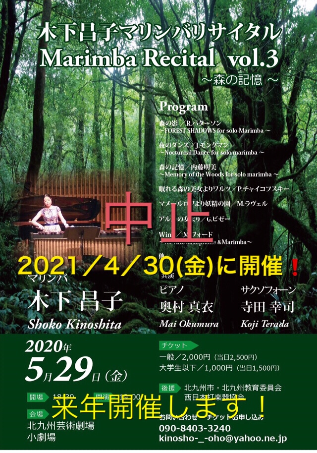 5月に開催予定でしたマリンバリサイタルは中止を決定致しました。5月は大丈夫かなと3月時点では思っていたのですが…状況も変わり、まだ決断は早いかなと思いつつ色々なことを考えて決定致しました。本当に安心して生演奏を楽しんでいただく時が早く来ることを願います。それまでは準備期間やこれからのために時間を使って色々と磨いていきたいと思います!木下昌子マリンバリサイタルは来年✨2021/4/30(金)19時✨からを予定していますので、どうぞよろしくお願い致します。