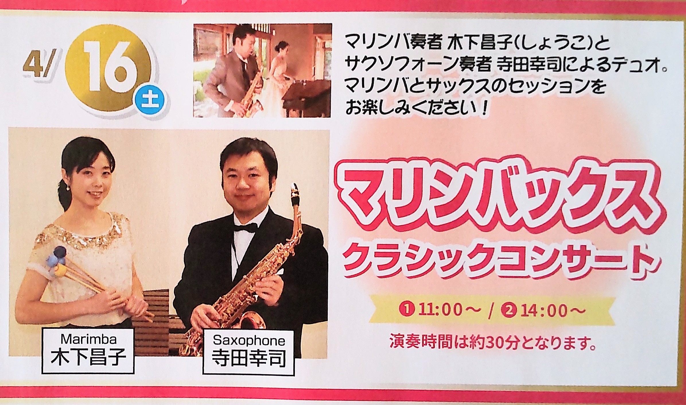 イベント演奏のご案内 投稿日: 2022年4月11日 投稿者: shokomarimba カローラ福岡北九州本店でのイベントで演奏させて頂きます♪クラシカルな音色で春にぴったりの馴染みの音楽をお届けします。清々しく心癒される時間になればと思います♪ 共有: X で共有 (新しいウィンドウで開きます) X Facebook で共有 (新しいウィンドウで開きます) Facebook いいね 読み込み中…